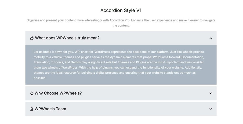 The advanced accordion feature of BlockWheel allows users to expand and display their content interestingly. This feature helps to simplify the content creation and management process for several website admins.