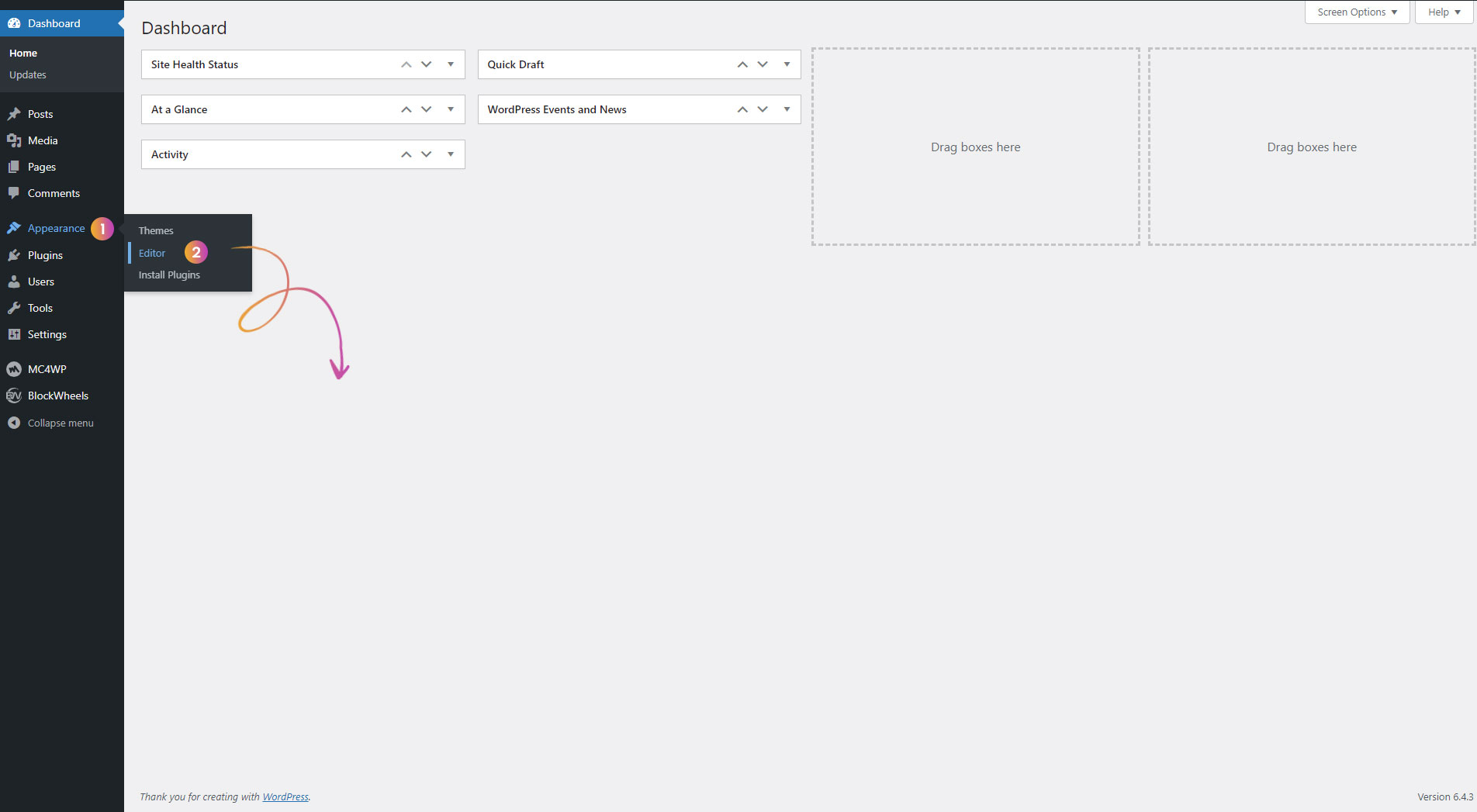 Once you activate the themes, go to Dashboard > Appearance. Then you can see the Editor option right below the Themes. Clock on the Editor and you can start with customizing your website.