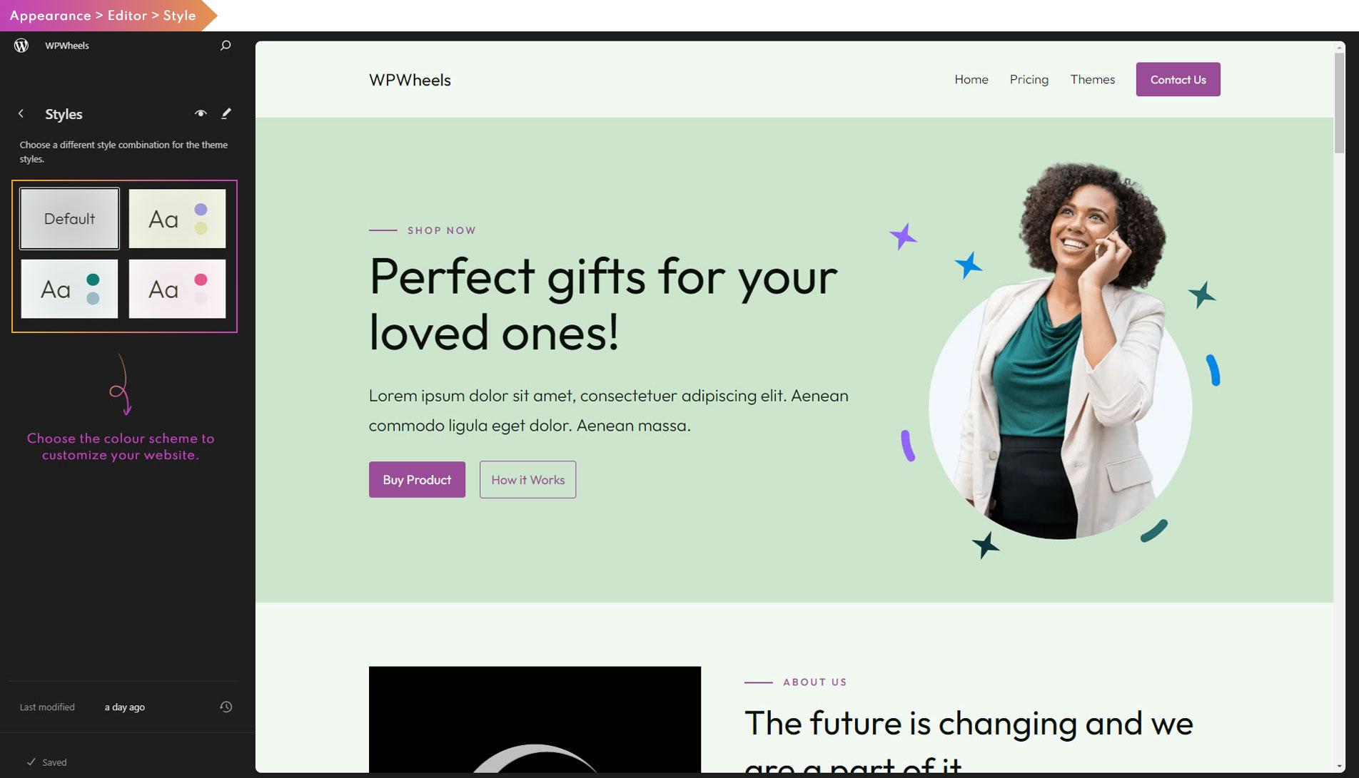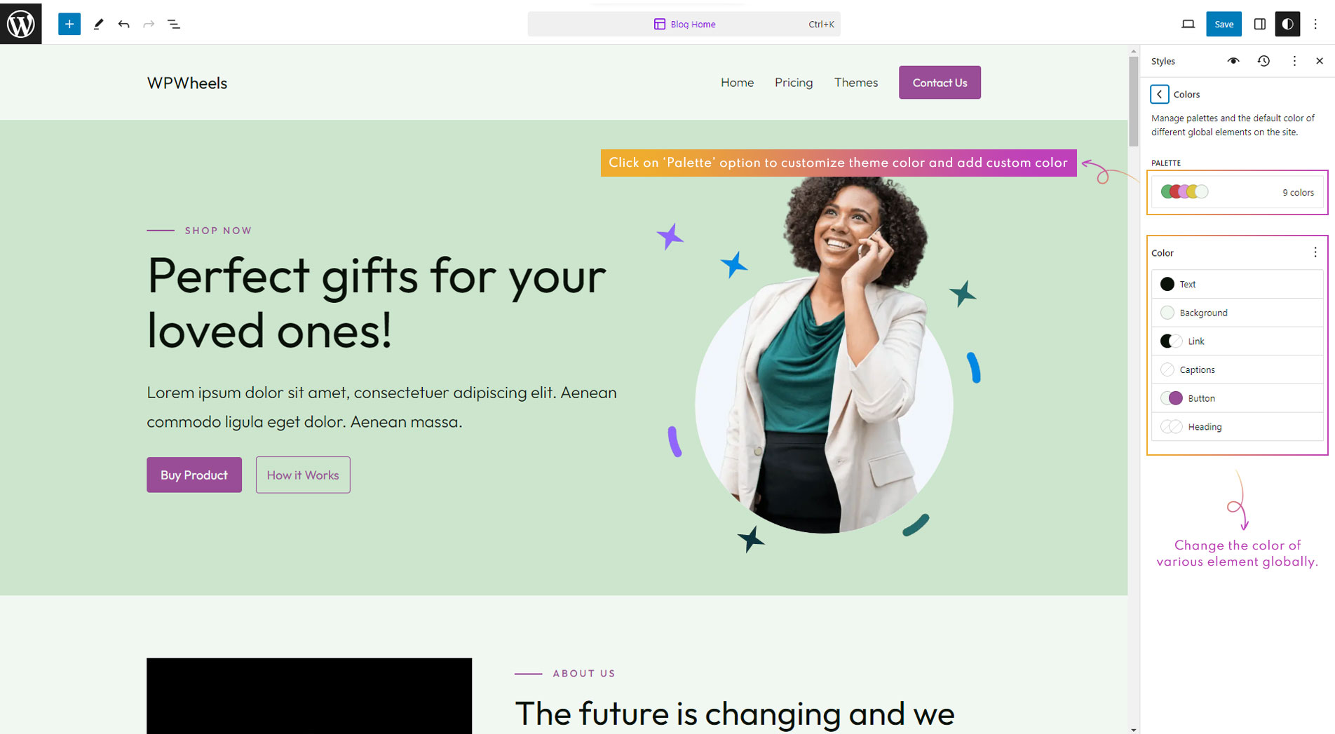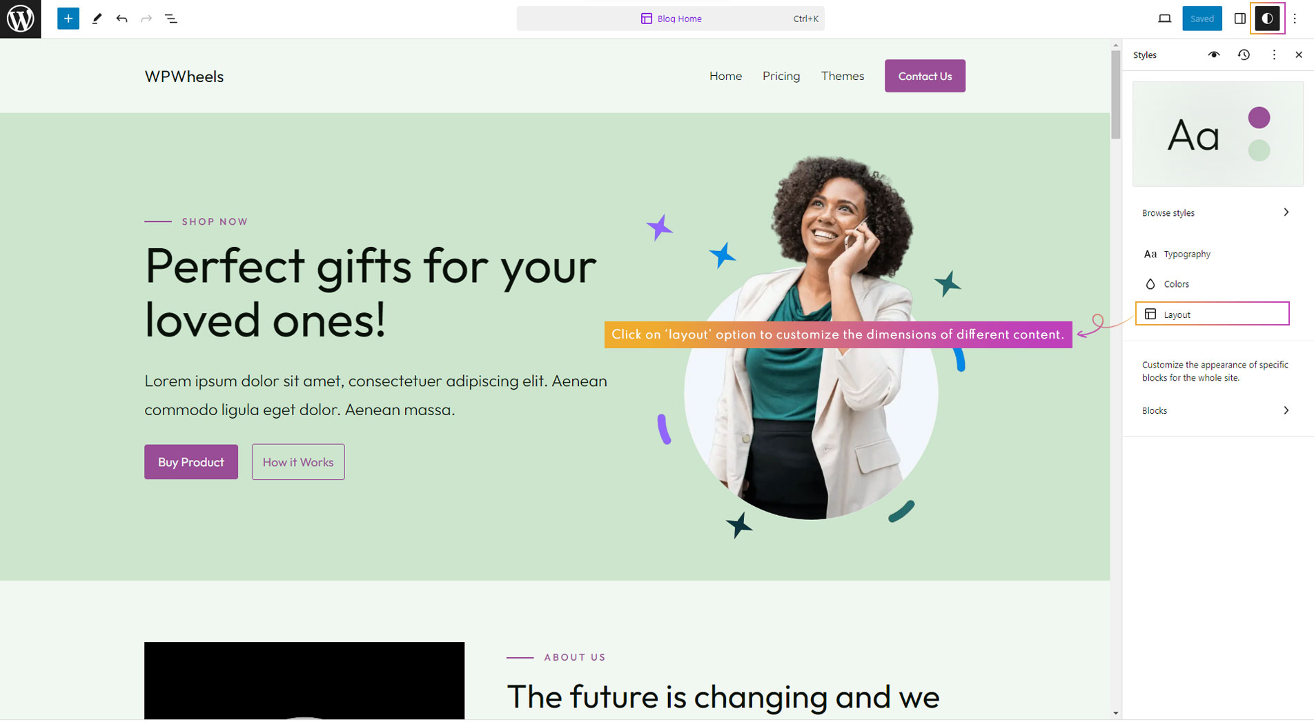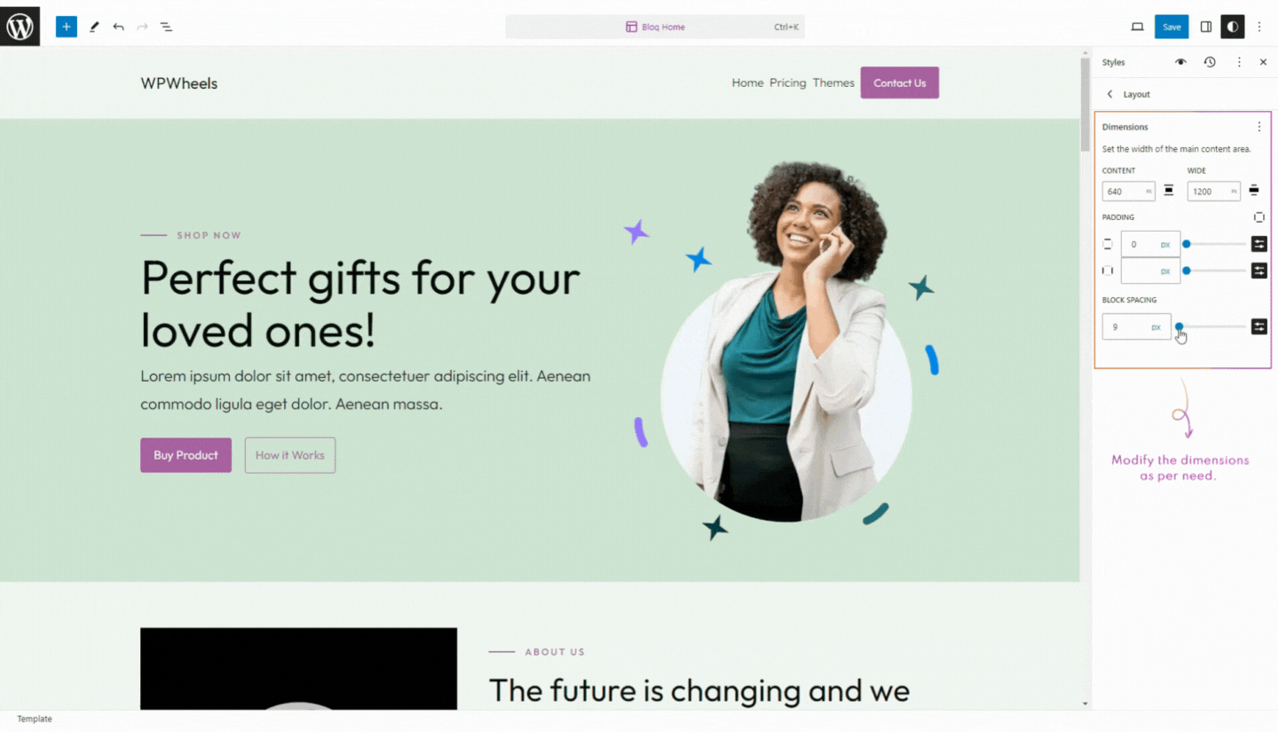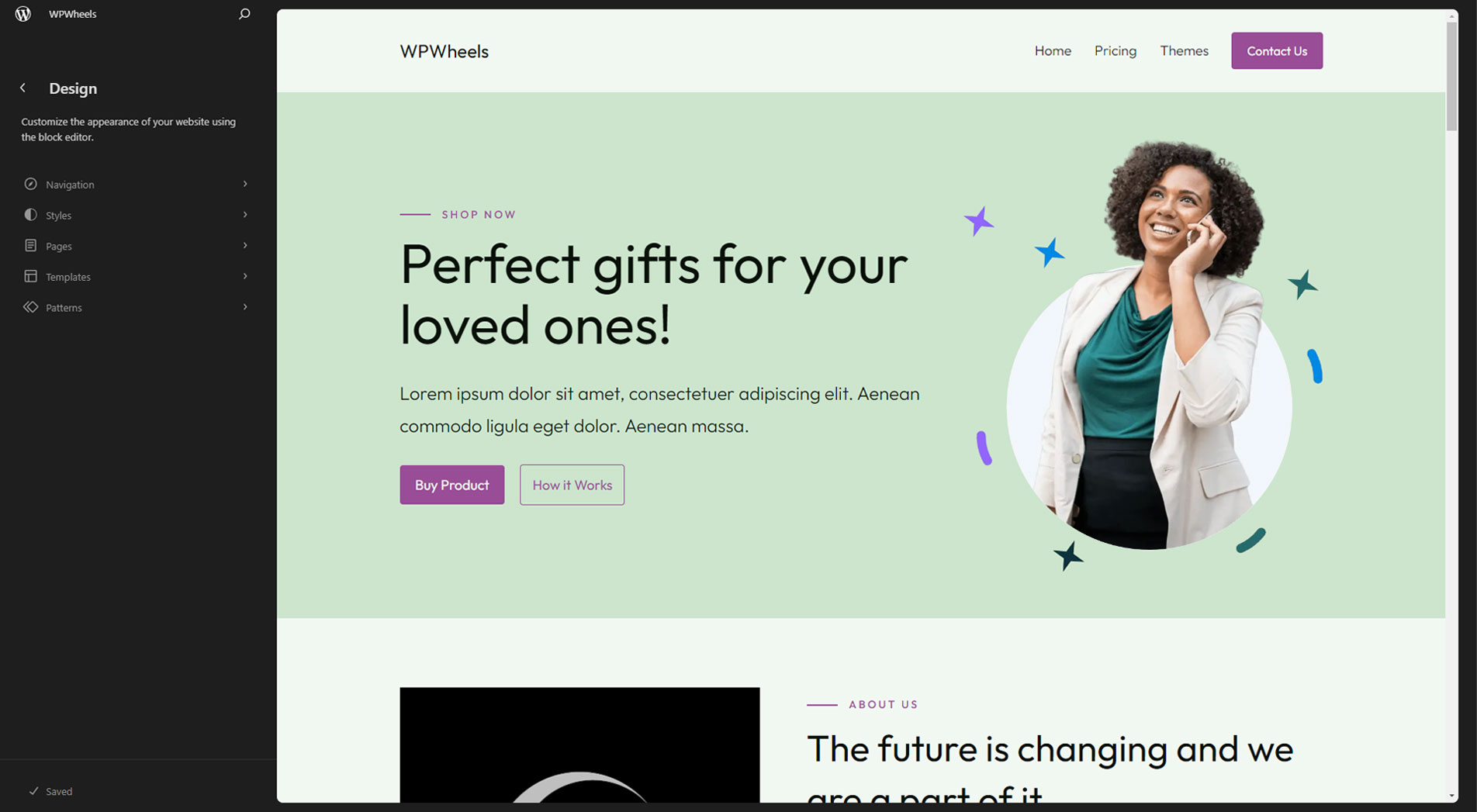 The BlockWheel themes are Full Site Editing themes. You can customize the website’s appearance using the block editor. It has the following options: