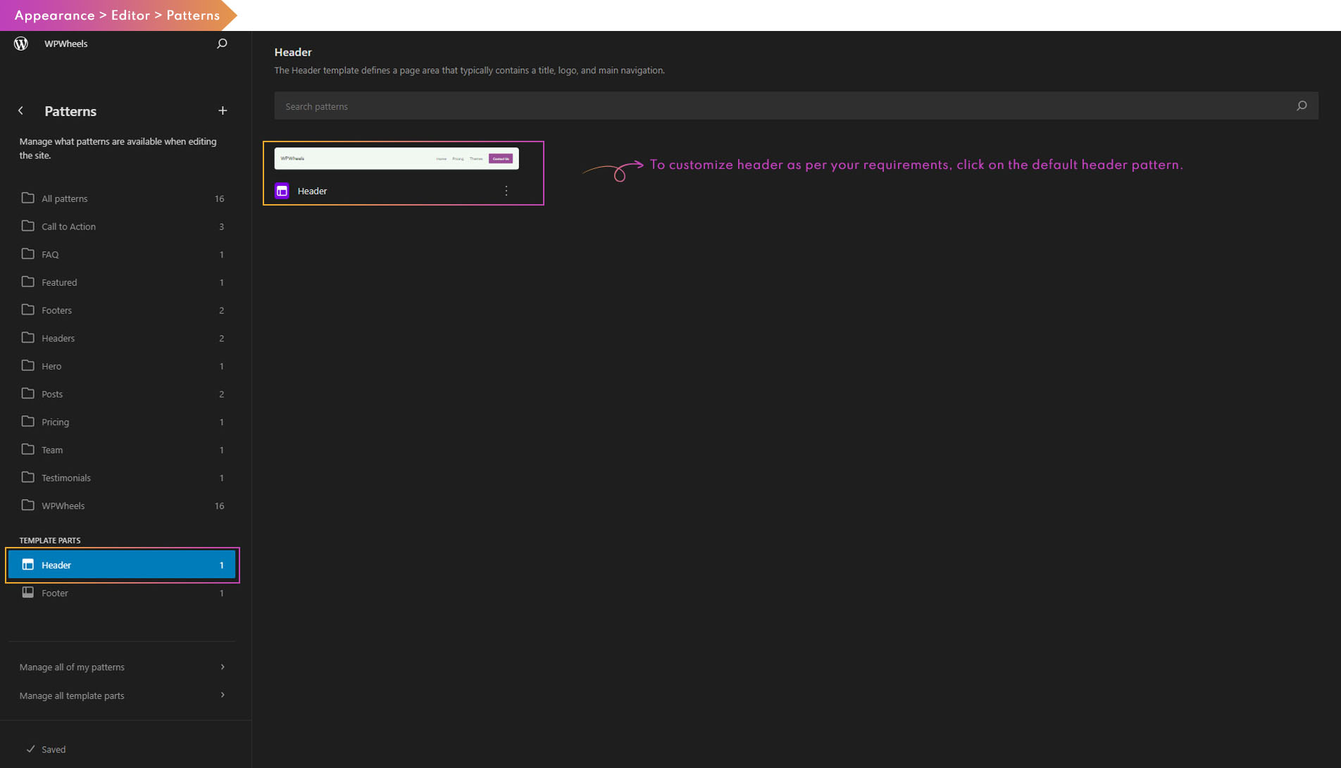 The option also includes template parts for customizing the header and footer. Similarly, it also includes the manage all patterns and template parts option.