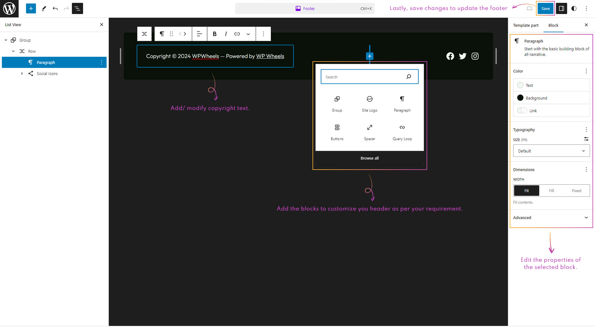 At the bottom of the screen, as you go on scrolling, you will see a footer. Click on the section to customize the footer and you can also insert social media icons. You can link the icon with the related social media platforms. Similarly, you can also change the color of the text, background, typography, and dimensions. The advanced setting includes block name, HTML anchor, additional CSS Class(es), and styles.