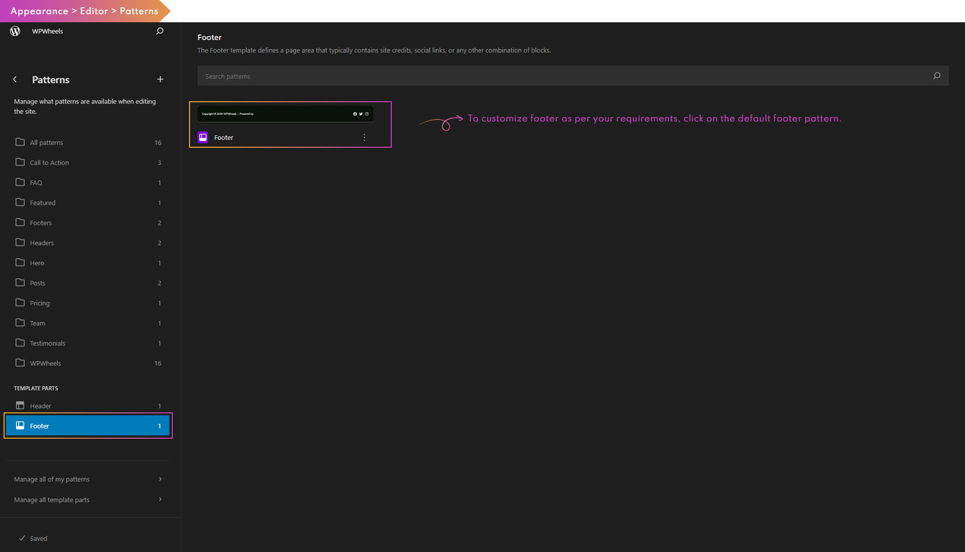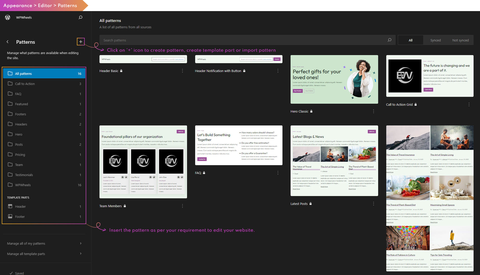 The patterns section allows you to manage what patterns are available while editing your website. These patterns include call to action, FAQs, features, footers, headers, posts, pricing, testimonials, and many more.