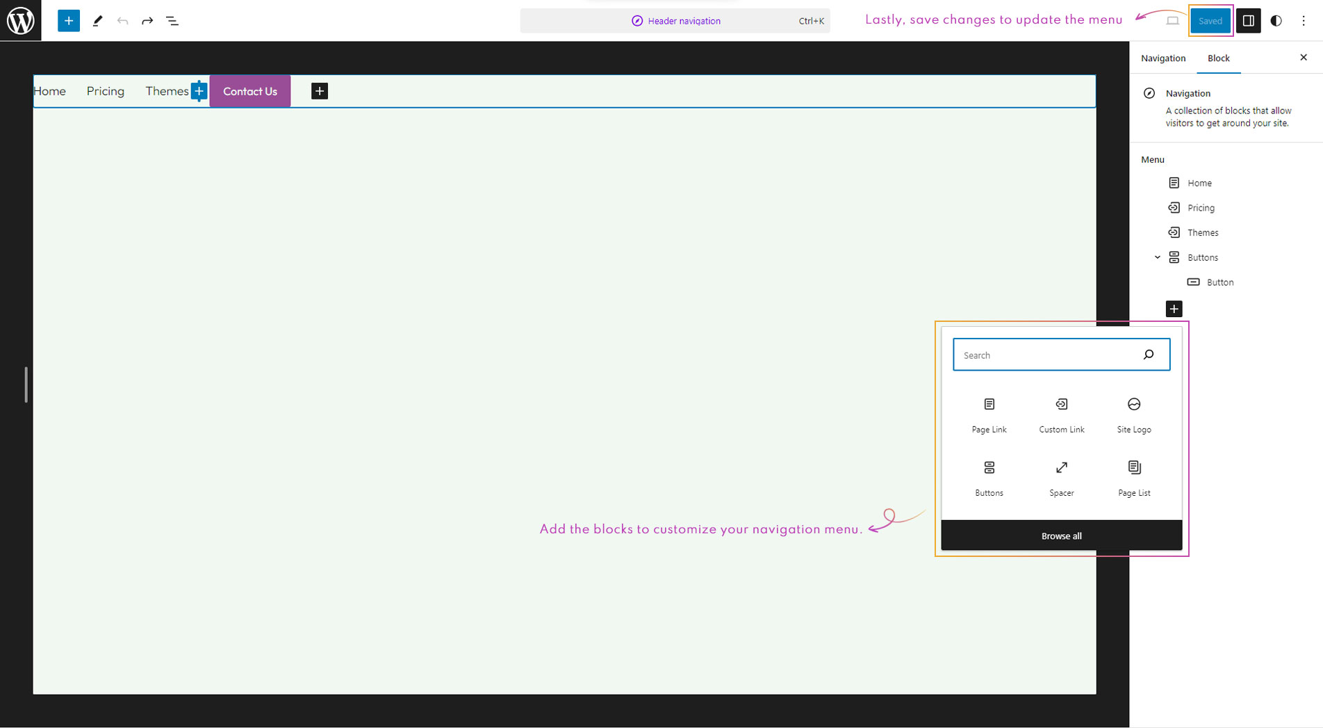 Once you click on the Design, you will see the Navigation. Click on Navigation and you will see different menus like home, culture, decor, food, lifestyle, and travel. These menus are a curated collection of blocks. It allows visitors to get around your website.